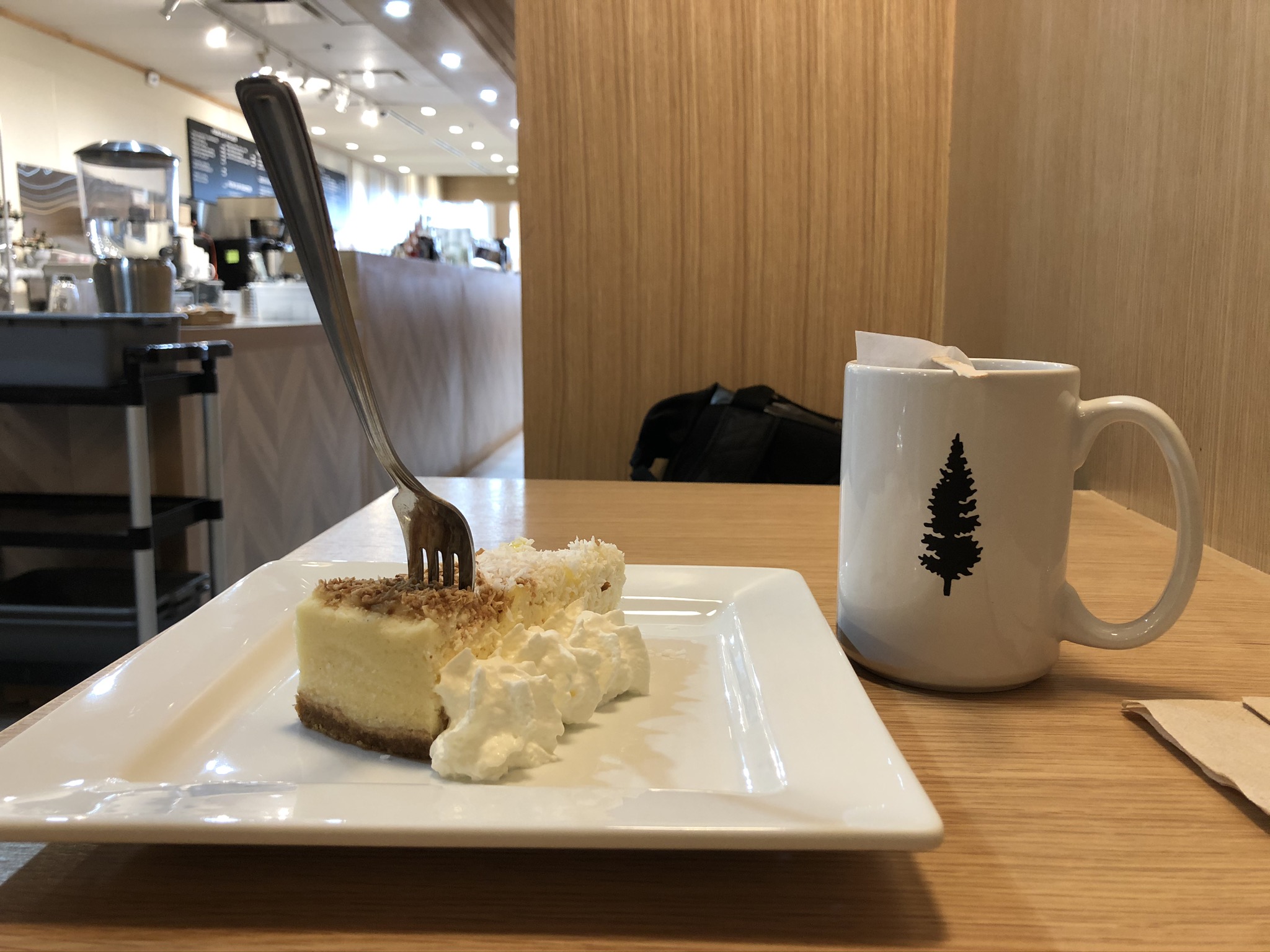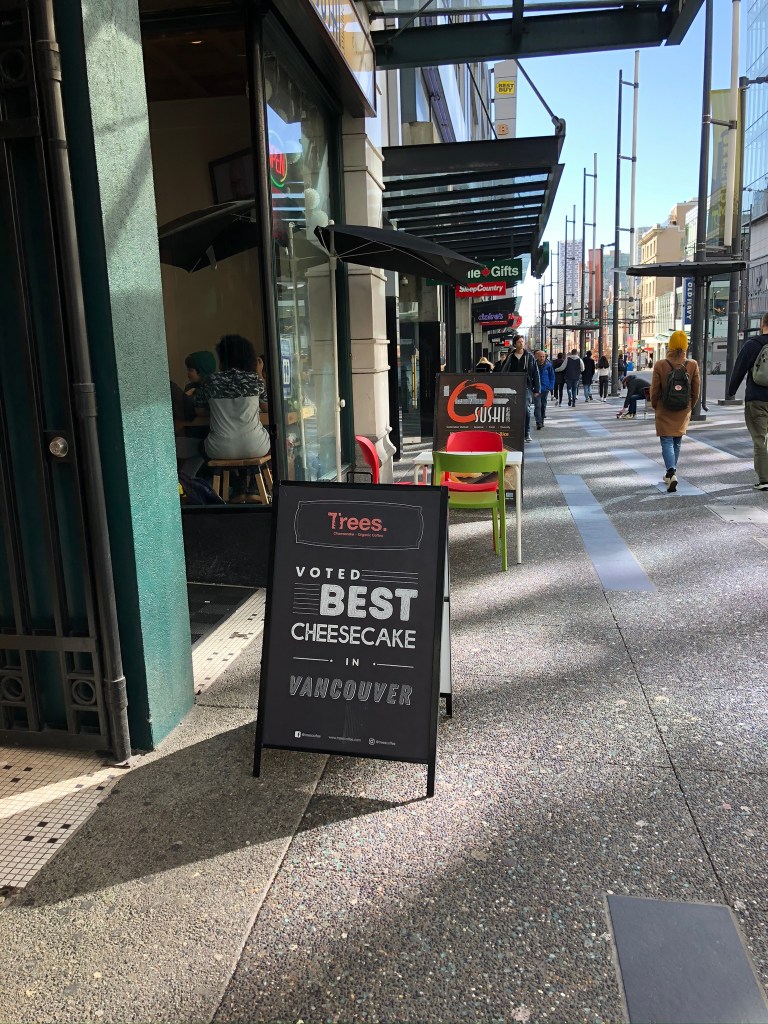So I saw this sign for Trees Organic Coffee on Granville Street in Vancouver last weekend when I went to see the musical Dear Evan Hansen and catch up with good friends. How could I resist?! After all, it says “voted BEST cheesecake in Vancouver!” Of course I went in to check it out. I love the simple wood decor with little booths for 2 tucked into the long side wall. Cool logo too! But back to the cheesecake…