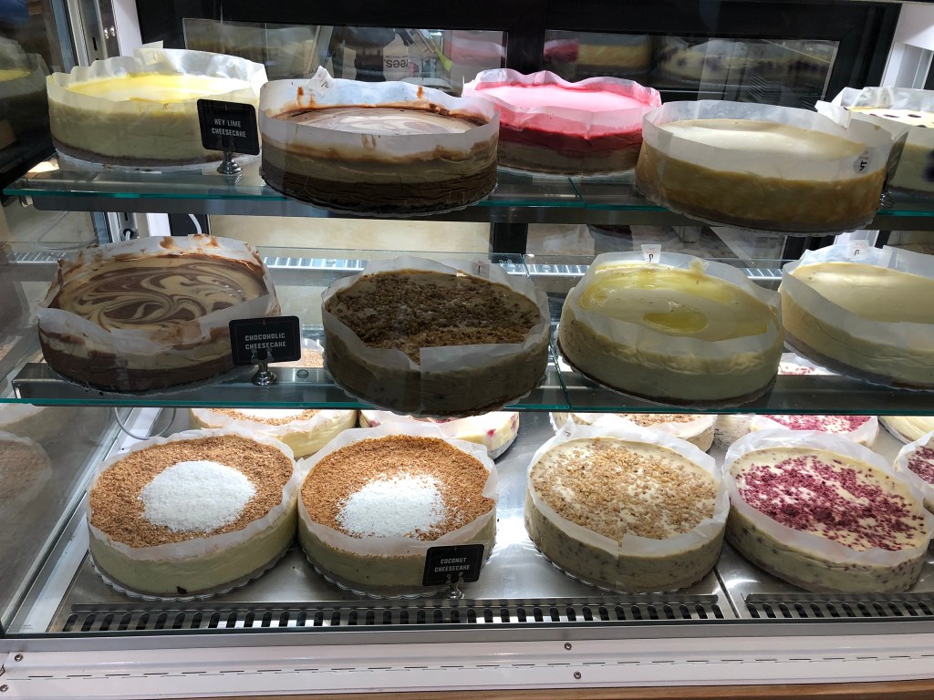 Look at all that yummy cheesecake! Key Lime Cheesecake, Chocoholic Cheesecake, Coconut Cheesecake Raspberry White Chocolate Cheesecake, Maple Walnut Cheesecake. How to choose?