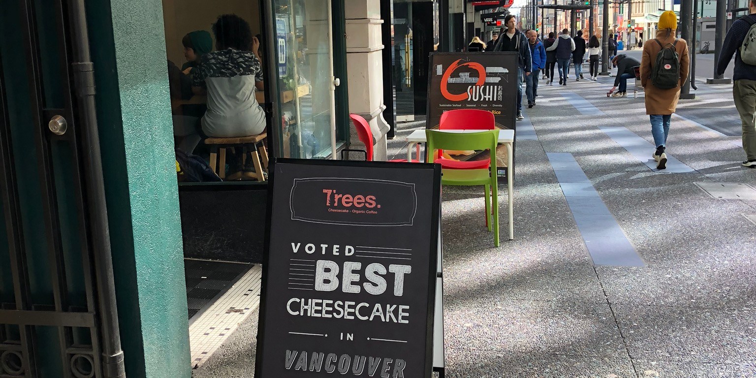So I saw this sign for Trees Organic Coffee on Granville Street in Vancouver last weekend when I went to see the musical Dear Evan Hansen and catch up with good friends. How could I resist?! After all, it says “voted BEST cheesecake in Vancouver!” Of course I went in to check it out. I love the simple wood decor with little booths for 2 tucked into the long side wall. Cool logo too! But back to the cheesecake…