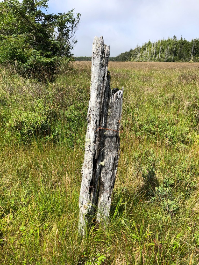 Other remnants of these two periods of early settlement remain. A neck of sand connects the expansive white sand beaches of Guise Bay and Experiment Bight. In 1910 N.P. Jensen constructed a driftwood fence and planted clover to stabilize the sand dunes for pasture. The clover and parts of the fence remain. Remnants of a 1908 corduroy road heads south from Eric Lake towards San Josef Bay. the bleached posts and dangling wire of a telegraph line built in 1913 can be seen in some of the open spaces. An old Caterpillar tractor sits in the forest.
